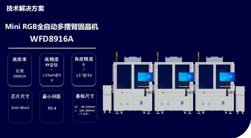 截至目前,針對(duì)直顯和背光市場(chǎng)需求,萬(wàn)福達(dá)已推出WFD8960B、WFD8970A、WFD8970B、WFD8916A等多款固晶機(jī),其中WFD8970B單機(jī)產(chǎn)能實(shí)測(cè)高達(dá)75K/H,RGB三臺(tái)串聯(lián)即WFD8916A產(chǎn)能實(shí)測(cè)200K/H,在業(yè)內(nèi)處于領(lǐng)先水平。與此同時(shí),萬(wàn)福達(dá)還推出Mini LED全自動(dòng)生產(chǎn)線相關(guān)設(shè)備及解決方案。